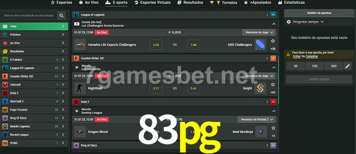 O 83pg oferece uma grande seleção de opções de apostas em e-sports com probabilidades competitivas